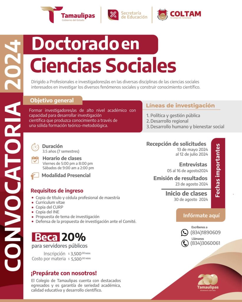 El Colegio de Tamaulipas te invita a sumarte al Doctorado en Ciencias Sociales. La convocatoria 2024 se encuentra abierta y puedes consultarla en: http://www.coltam.edu.mx/doctorado/