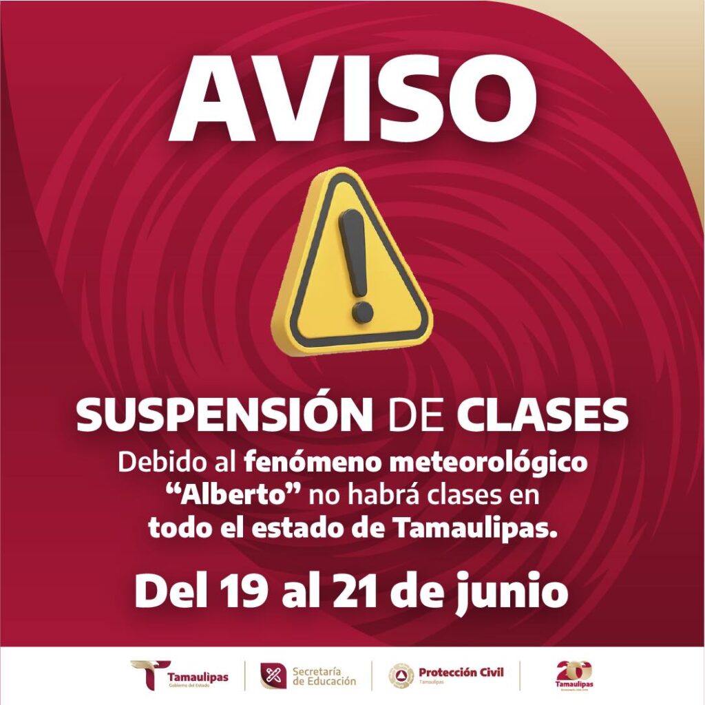 Con el objeto de resguardar la integridad de las comunidades escolares y como consecuencia del desarrollo y trayectoria del fenómeno meteorológico “Alberto”, se anuncia la suspensión de clases en toda la entidad y en todos los niveles educativos a partir del día miércoles 19 de junio hasta el viernes 21.