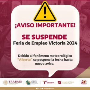 SE SUSPENDE Feria de Empleo Victoria 2024 Debido al fenómeno meteorológico “Alberto” se pospone la fecha hasta nuevo aviso. Mantengámonos...