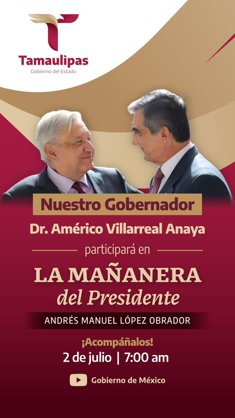 Nuestro gobernador Américo Villarreal participará en “La Mañanera” del Presidente Andrés Manuel López Obrador. Te invitamos a seguir la transmisión en vivo mañana 02 de Julio 2024
