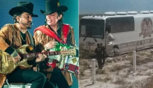 Por una mala maniobra de otro conductor el autobús de la agrupación Los Dos Carnales se salió de la carretera,...