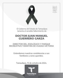 Expresamos nuestra solidaridad con los familiares y amigos del Director del Zoológico y Parque Recreativo Tamatán, Juan Manuel Guerrero Garza